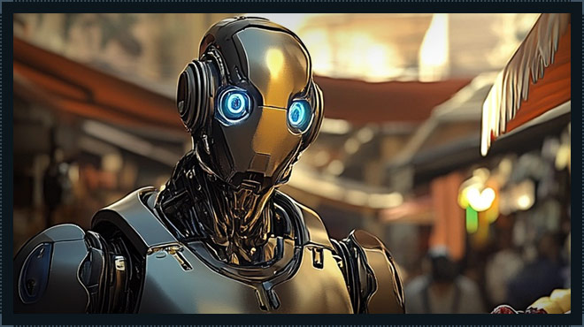 Rael-7 is a merchant of the bustling marketplace, his cybernetic arm effortlessly slicing fruit with inhuman precision, his glowing eyes scanning for the ripest selections. With a friendly demeanor and a vendor’s charm, he calls out to passing customers. But this service is a cover for his true purpose. Every transaction, every idle conversation, is a chance to gather data for his secret, obsessive project: to quantify a part of the human experience and make it part of himself.